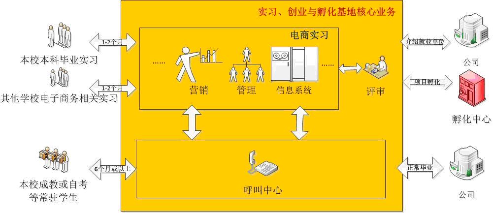 另外,我院根据现有的BPO培训特点,整合学校物流学院拥有电子商务国家级特色专业和继续教育学院生源较为丰富的优势,拟在四川省商务厅、科技厅等部门的支持下建立“成都信息工程学院大学生实习、创业与孵化基地”,基地先期以电子商务类的实习、创业、孵化为主。基地预计每年可以完成学校校内相关专业200-300人次的课程实习、毕业实习和创业、孵化工作,完成其他学校电子商务类专业的毕业实习300人次,完成本校成教自考的电子商务及相关专业的学生培训、实习、创业工作300人次。基地一期建设工程示意图如下: