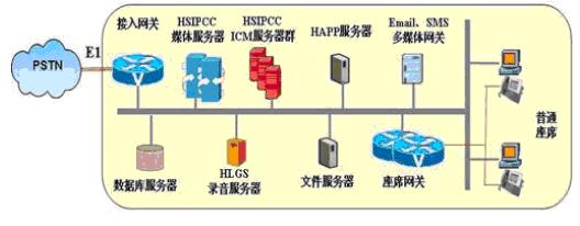 BPO基地一般均配备了专业机房、不间断电源、高性能服务器和网关设备,采用IP式呼叫中心软硬件系统,系统结构示意图如下: